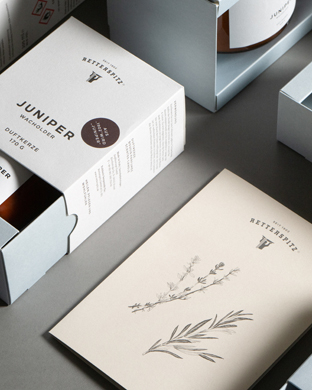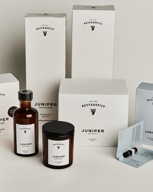 As FYFF was “lucky enough to find a well-thought-out corporate design already in place”, it was just a matter of fine-tuning things: As well as softer, more approachable photographic visuals, placing new illustrative elements that lent a charming touch. And it was clear that a new kind of paper would be instrumental in subtly conveying the premium quality of the products. The offset paper that was previously used was replaced with Bio Cycle – because this ties in with the Retterspitz brand’s commitment to sustainability. As FYFF’s Creative Director Andreas Amtmann explains: “That was the ideal paper for us as it combines sustainability with an aesthetic look and a great feel.” Embossed with an individual surface pattern, all business stationery, communication media and some of the packaging adhered rigidly to this form from then on. The creamy off-white packaging provides a distinctive stage for the brand and also envelops the new wellbeing products like the newly launched perfume and room scent.
