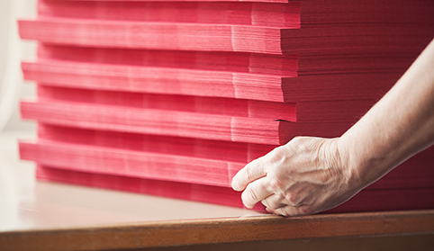 Der kompromisslose Qualitäts- und Serviceanspruch von Gmund Papier macht Kunden weltweit erfolgreicher. Um die hohen Standards zu garantieren, findet im Papiersaal am Standort eine Bogenkontrolle statt. Hier vertraut man zusätzlich auf die Hände und den geübten Blick besonders erfahrener Mitarbeiterinnen. Sie haben über die Jahrzehnte ein unvergleichliches Feingefühl und Auge für Papier entwickelt, das keine Maschine ersetzen kann. Sie prüfen die Bogen einzeln von Hand. Deshalb liegt jedem ausgelieferten Ries ein Zertifikat für geprüftes und garantiert einwandfreies Qualitätspapier bei. Die Bogen werden auf der Vorder- und Rückseite kontrolliert und gezählt. Anschließend werden die Papiere von zwei Kolleginnen per Hand eingeriest. Die sorgfältige Überprüfung jedes Einzelbogens Papier und der Umgang mit unseren vielfältigen Kollektionen machen den Papiersaal zu einer Schlüsselabteilung bei Gmund Papier.