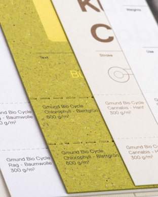 Customers who opt for Gmund Bio Cycle paper not only achieve aesthetic benefits, but also gain genuine added value in terms of design, feel and credibility. In particular, companies that want to emphasise their green corporate philosophy appreciate this collection as an ideal solution for their packaging, brochures and print communication.