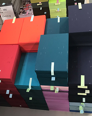 «228 références de papier sont envoyées par Gmund à notre partenaire d’impression, conditionnées manuellement par Gmund», explique Peter Kunz en parlant du processus. « Il faut d’abord les mettre dans le bon ordre de production et d’impression. Le tri préalable des différents types de papier se fait manuellement chez nous ». Ensuite, les feuilles sont imprimées en offset et coupées, en argent ou en noir selon la couleur. Les cahiers sont ensuite assemblés en sept blocs maximum par un relieur, selon le modèle de déroulement. « Ce qui est important ici », souligne Peter Kunz, « c’est le contrôle continu de chaque bloc. Tant par la pagination manuelle que par la pesée ».