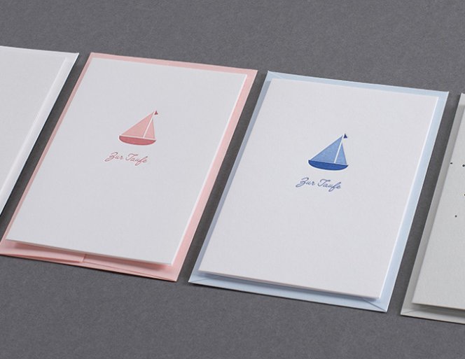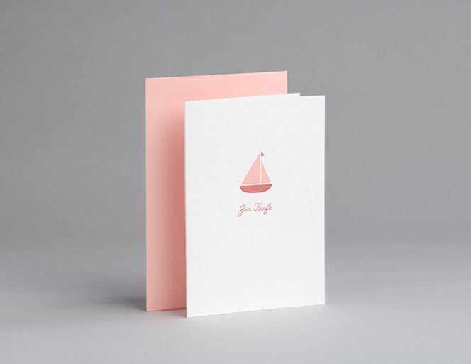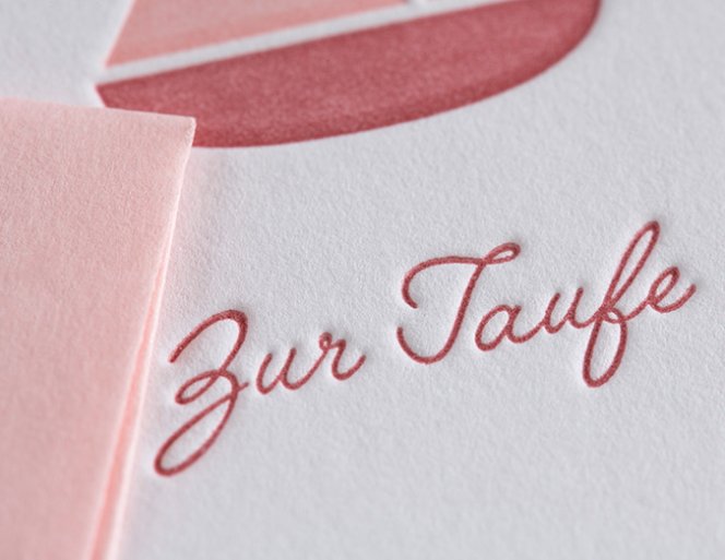 Gmund Cotton Papier ist nicht umsonst der Liebling des Buchdrucks: Die tiefe Prägung kommt dank der sanften Oberfläche des Papiers perfekt zur Geltung. Zur Taufe wirkt dieser zweifarbige Buchdruck besonders schön. Diese Karte ist auch in einem zarten Blauton erhältlich.