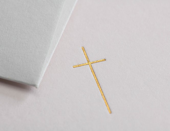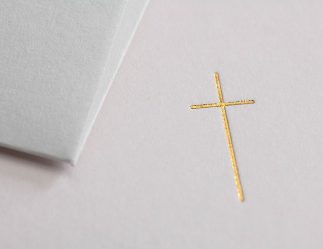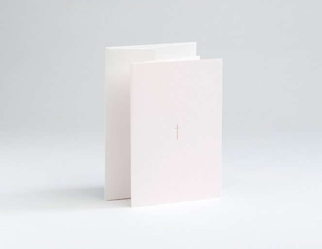 Farbintensiv, kombinationsstark, extensiv, büttenmatt. Unser Gmund Colors Matt Papiersortiment gibt dieser Grußkarte den unverwechselbaren Anstrich. Feine Heißfolienprägung in dezenten Farbtönen veredelt das Papier und ergibt ein harmonisches Zusammenspiel. Eine Klappkarte zu religiösen Festen mit einem Kreuz in Gold.