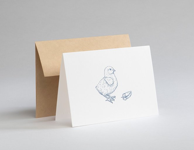 Das Küken - unser beliebtes Motiv zu den Ostertagen auf einer Klappkarte umgesetzt. Blauer Buchdruck auf feinen, pastelligen Papierfarben aus der Gmund Papier Kollektion. Kombiniert mit einem Kuvert aus nachhaltigem, ungebleichtem Papier. Eine wunderschöne Grußkarte, die durch hochwertiges Druckhandwerk zu begeistern weiß.