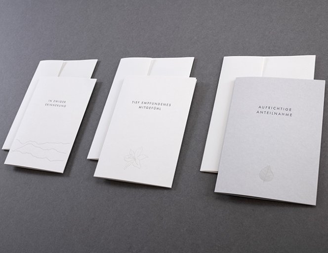 Trauerkarte in zurückhaltendem Design mit einem fein geprägten Blatt. Mit den Worten "Aufrichtige Anteilnahme" in schlichter Typografie kondolieren Sie mit dieser Klappkarte sehr stilvoll. Buchdruck auf grauem Gmund Used Papier, das aus 100% Altpapier hergestellt wird.