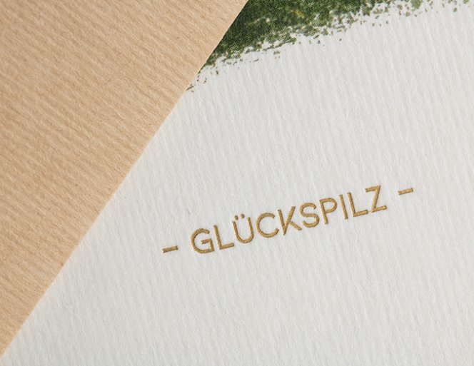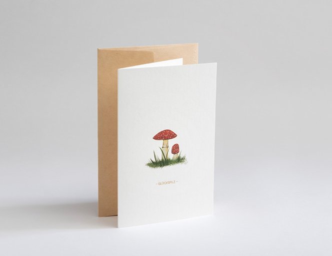 Kombiniert mit einer feinen Prägung in einem matten Goldton überzeugt diese Grußkarte mit einem Glückspilz in Aquarelltechnik. Eine sehr geschmackvolle Wahl für viele Anlässe. Design by Gmund Papier.