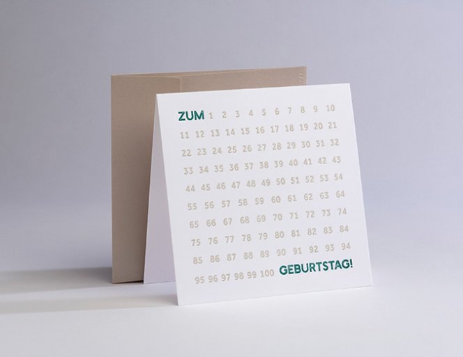 Zum Geburtstag, insbesondere für ein Jubiläum, darf es gerne eine ganz außergewöhnliche Grußkarte sein. Im besonderen Quadro-Format bietet diese Karte gleich zwei Papierveredelungen. Geprägte, passende Jahreszahl hervorheben und damit immer die richtige Karte zum Anlass. Gedruckt auf strahlend weißem 100% Baumwollpapier in Kombination mit einer kräftigen neonfarbenen Briefhülle.