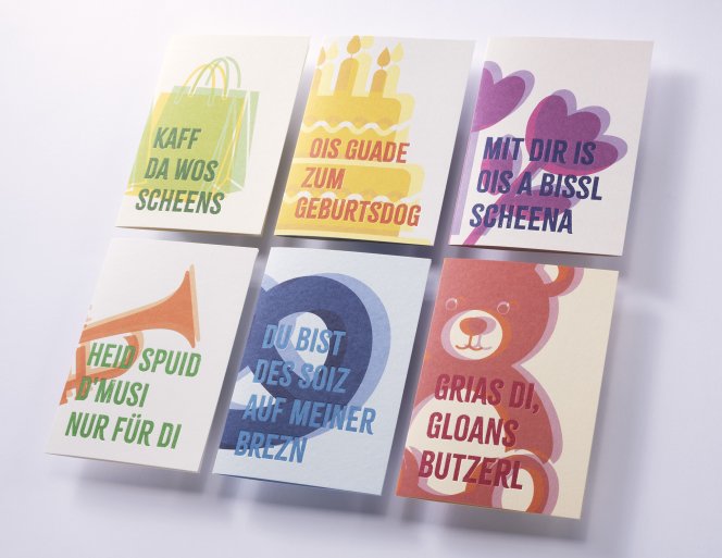 Diese fröhliche 6er-Serie bringt Farbe und gute Laune auf den Tisch. Jede Karte kombiniert farbenfrohe Motive mit typisch bayerischen Sprüchen und einem geprägten Schriftzug, der dem Design eine besondere Haptik verleiht.