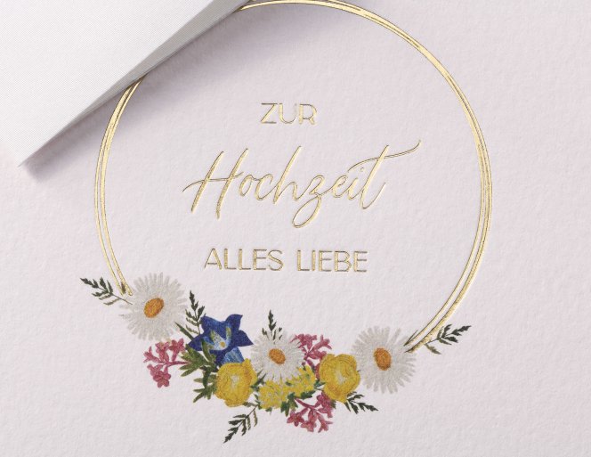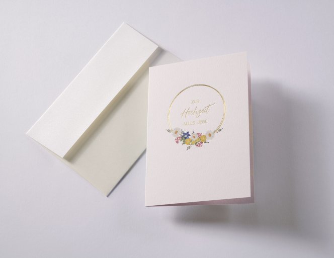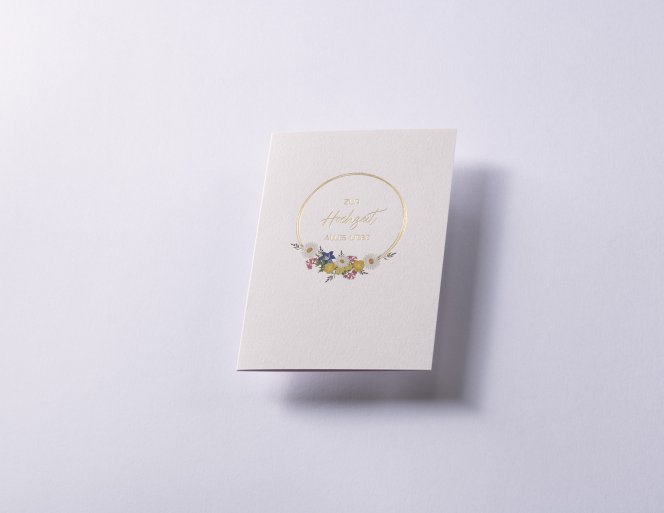 Offsetdruck trifft auf filigrane goldene Heißfolienprägung – ein perfektes Duo, das jede Karte zum echten Blickfang macht.