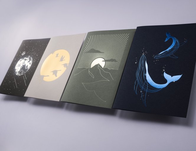 Tauchen Sie ein in die stille Schönheit unserer Universe-Kollektion: vier kunstvolle Karten, die die Magie der Natur in filigranen Heißfolienmotiven einfangen.