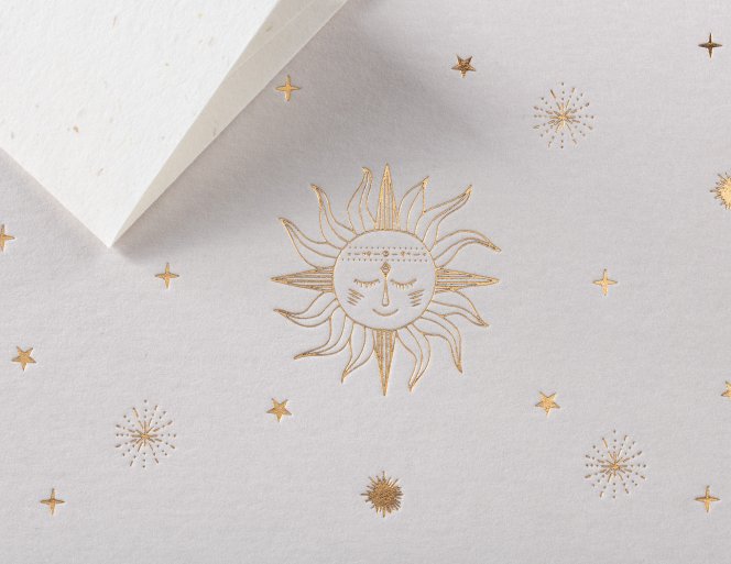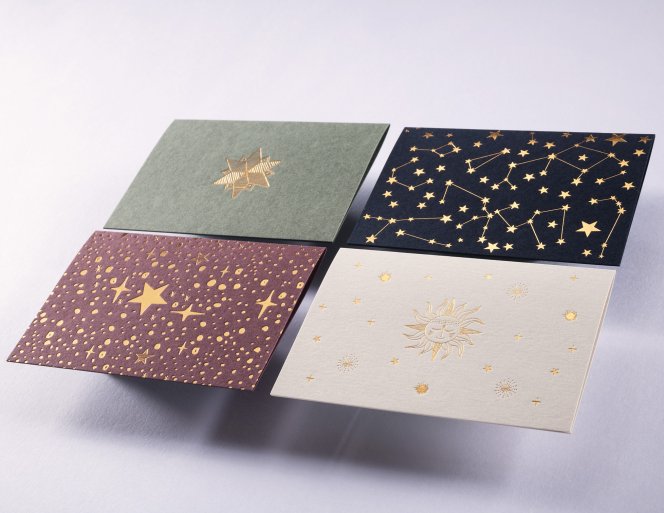 Unsere edle Kartenserie im handlichen C7-Format (A7) begeistert mit himmlischen Motiven in goldener Heißfolienprägung – funkelnde Sterne, strahlende Sonnen und zarte Sternbilder verleihen jeder Karte eine besondere Magie.