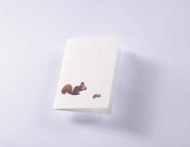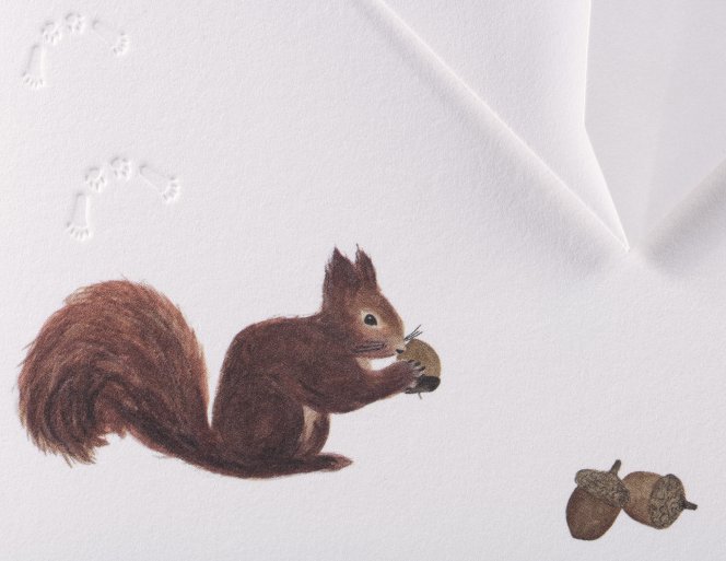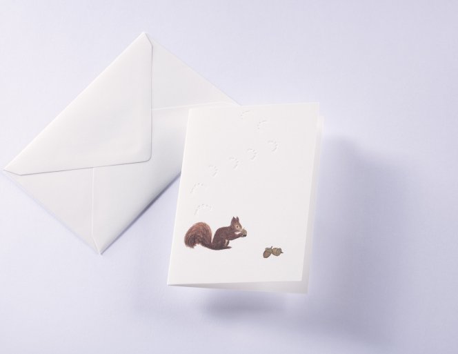 Entdecken Sie die zauberhafte Grußkarte aus der Serie Spuren im Schnee. Hergestellt aus 100 % hochwertigen Baumwollfasern, überzeugt diese Karte durch ihre feine Haptik und elegante Optik. Ein liebevoll illustriertes Eichhörnchen, das sich zu zwei Eicheln gesellt, ziert die Vorderseite – Eine dezente, blindgeprägte Spur im Schnee sorgt für einen besonderen, fühlbaren Effekt sorgt.