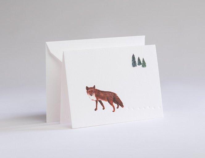 Das voluminöse Papier aus 100% Baumwollfaser ist aufgrund seiner Beschaffenheit prädestiniert für Buchdruck-Anwendungen. Mit einer filigranen Blindprägung wurde hier eine Winterspur nachgeahmt. Kombiniert mit dem satten Offsetdruck entsteht hier ein wunderschönes winterliches Motiv, welches nicht nur optisch, sondern auch haptisch, wahre Freude macht.