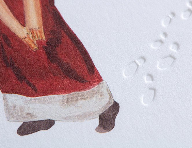 Das voluminöse Papier aus 100% Baumwollfaser ist aufgrund seiner Beschaffenheit prädestiniert für Buchdruck-Anwendungen. Mit einer filigranen Blindprägung wurde hier eine Winterspur nachgeahmt. Kombiniert mit dem satten Offsetdruck entsteht hier ein wunderschönes winterliches Motiv, welches nicht nur optisch, sondern auch haptisch, wahre Freude macht.