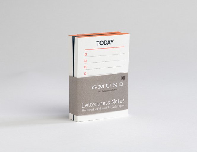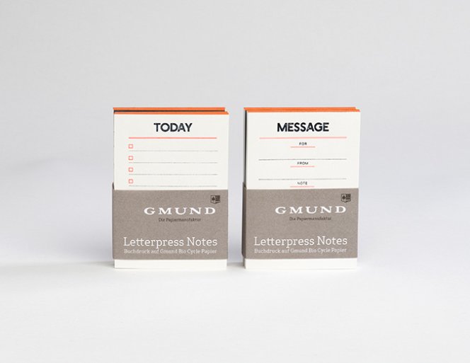 Gmund Letterpress Notes Set - Notizzettel für Liebhaber feinster Papiere und Druckhandwerk. Ein Set besteht aus zwei Blöcken in den Designs TODAY für tägliche Erinnerungen und MESSAGE für Nachrichten an Familie, Freunde und Kollegen. Gmund Bio Cycle Papier ist durch die Verwendung 100% recycelter Fasern nachhaltig und ökologisch.