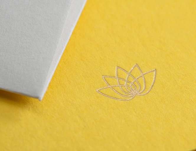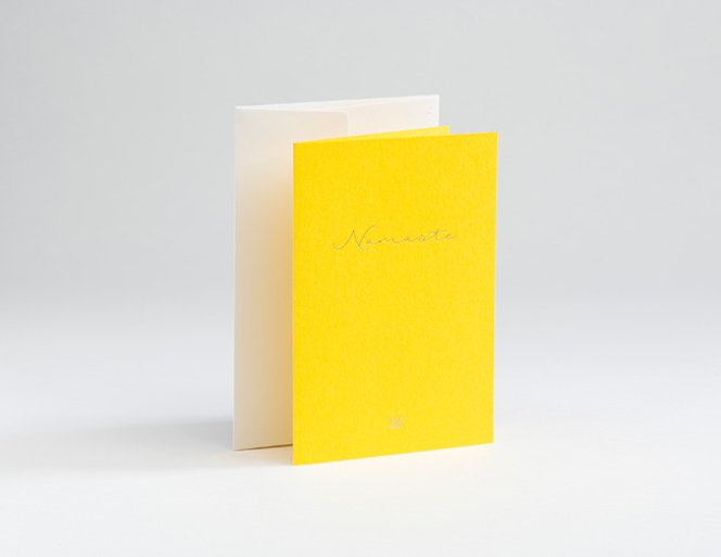Namaste! Farbintensiv, kombinationsstark, extensiv, büttenmatt. Unser Gmund Colors Matt Papiersortiment gibt dieser Grußkarte den unverwechselbaren Anstrich. Feine Heißfolienprägung in dezenten Farbtönen veredelt das Papier und ergibt ein harmonisches Zusammenspiel. Ausdrucksstarkes Gelb, das in der Yoga-Lehre für Sonne und Leuchten steht, trifft hier auf die Silhouette der Lotusblüte. Ein Muss für jeden Yogi.