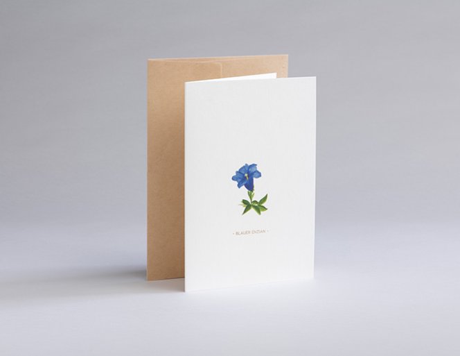 Natürlich, ehrlich, roh und ursprünglich - die nachhaltigen Klappkarten aus der Botanicals Serie. Der elementare Charakter des Materials Gmund No Color No Bleach schafft Raum für Fantasie. Kein Blatt gleicht dem anderen - ein Unikat! So wie die Natur mit jeder Enzianblüte einzigartige Formen und Farben kreiert. Kombiniert mit einer feinen Prägung in einem matten Goldton überzeugt diese Grußkarte mit einem Enzian-Motiv in Aquarelltechnik. Eine sehr geschmackvolle Wahl für viele Anlässe. Design by Gmund Papier.