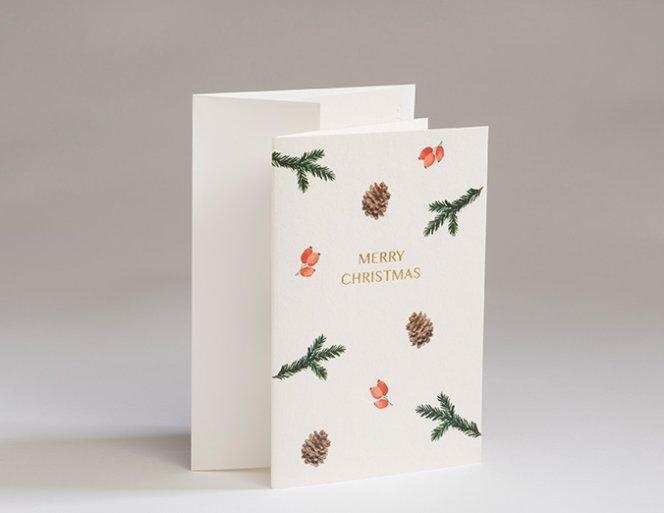 Weihnachtliche Karte mit goldener Heißfolie auf Gmund Hanf Papier. Inklusive passender Briefhülle.