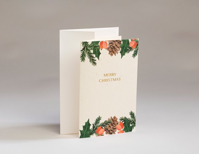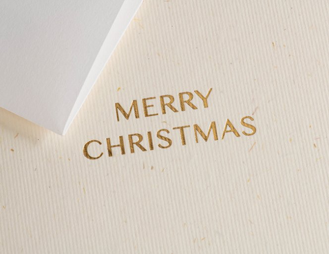 Weihnachtliche Karte mit goldener Heißfolie auf Gmund Stroh Papier. Inklusive passender Briefhülle.