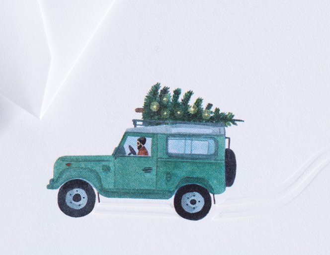 Wenn im Autoradio zum ersten Mal der bekannte Weihnachtshit gespielt wird, kommt ein besonderes Gefühl auf. Mit der Winterkarte "Driving home" greifen wir genau dieses Gefühl auf und drücken es in einer illustrierten Karte aus. Verschenken Sie diese liebevoll gezeichnete Weihnachtskarte auf zartem Papier aus 100% Baumwollfasern. Die filigran geprägten Spuren im Schnee kommen auf dem voluminösen Papier besonders gut zur Geltung. Diese winterliche Grußkarte macht sowohl optisch als auch haptisch Lust auf Winter und Spaß im Schnee!