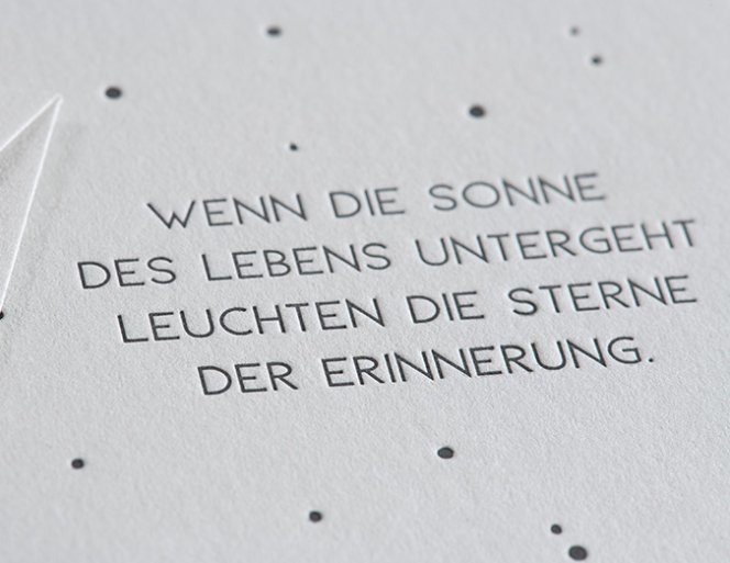 Gmund Cotton Papier ist nicht umsonst der Liebling des Buchdrucks: Die tiefe Prägung kommt dank der sanften Oberfläche des Papiers perfekt zur Geltung. Zum stilvollen Kondolieren finden Sie hier das passende Motiv.