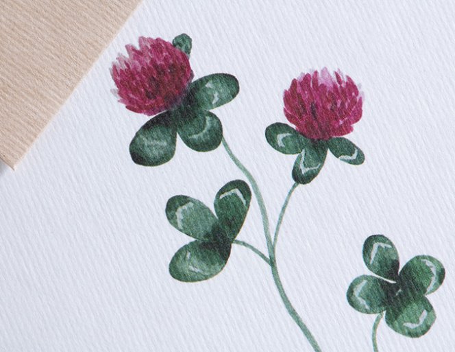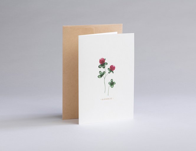 Natürlich, ehrlich, roh und ursprünglich - die nachhaltigen Klappkarten aus der Botanicals Serie. Der elementare Charakter des Materials Gmund No Color No Bleach schafft Raum für Fantasie. Kein Blatt gleicht dem anderen - ein Unikat! So wie die Natur mit jedem Kleeblatt einzigartige Formen und Farben kreiert. Kombiniert mit einer feinen Prägung in einem matten Goldton überzeugt diese Grußkarte mit einer Kleeblattzeichnung in Aquarelltechnik. Eine sehr geschmackvolle Wahl für viele Anlässe. Design by Gmund Papier.