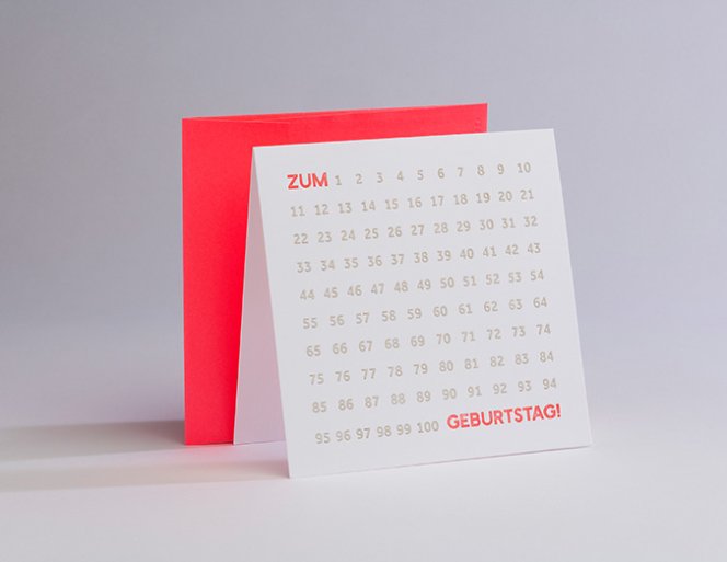 Zum Geburtstag, insbesondere für ein Jubiläum, darf es gerne eine ganz außergewöhnliche Grußkarte sein. Im besonderen Quadro-Format bietet diese Karte gleich zwei Papierveredelungen. Geprägte, passende Jahreszahl hervorheben und damit immer die richtige Karte zum Anlass. Gedruckt auf strahlend weißem 100% Baumwollpapier in Kombination mit einer kräftigen neonfarbenen Briefhülle.