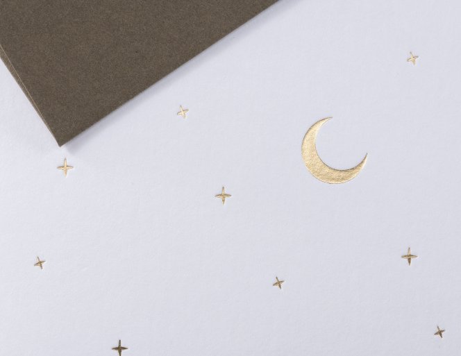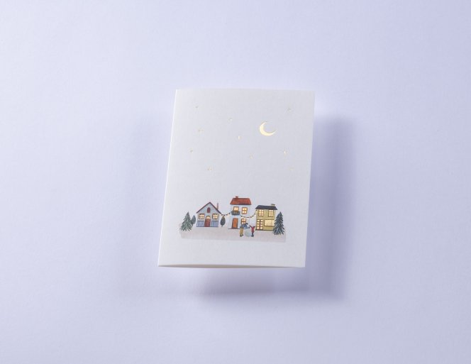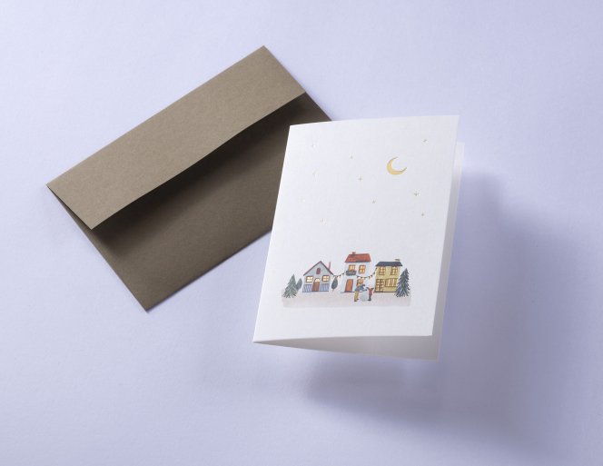 Diese edle Grußkarte aus 100 % Baumwollpapier von Gmund vereint Qualität und Ästhetik. Eine liebevoll illustrierte Häuserzeile wird durch feine goldene Heißfoliendetails zum Leuchten gebracht – kleine Lichtpunkte in den Fenstern und an einer Lichterkette sorgen für eine besondere Atmosphäre.
