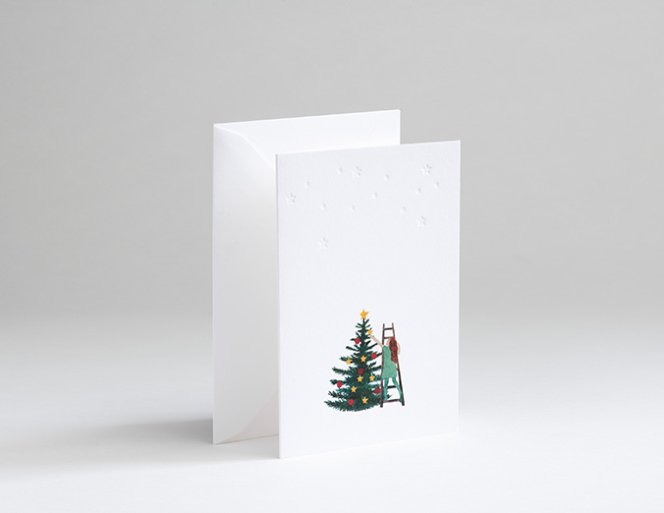Das voluminöse Papier aus 100% Baumwollfaser ist aufgrund seiner Beschaffenheit prädestiniert für Buchdruck-Anwendungen. Mit einer filigranen Blindprägung wurde hier eine Winterspur nachgeahmt. Kombiniert mit dem satten Offsetdruck entsteht hier ein wunderschönes winterliches Motiv, welches nicht nur optisch, sondern auch haptisch, wahre Freude macht.