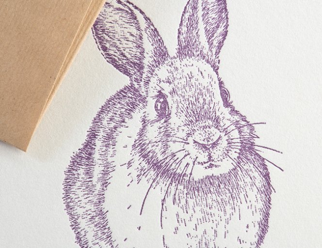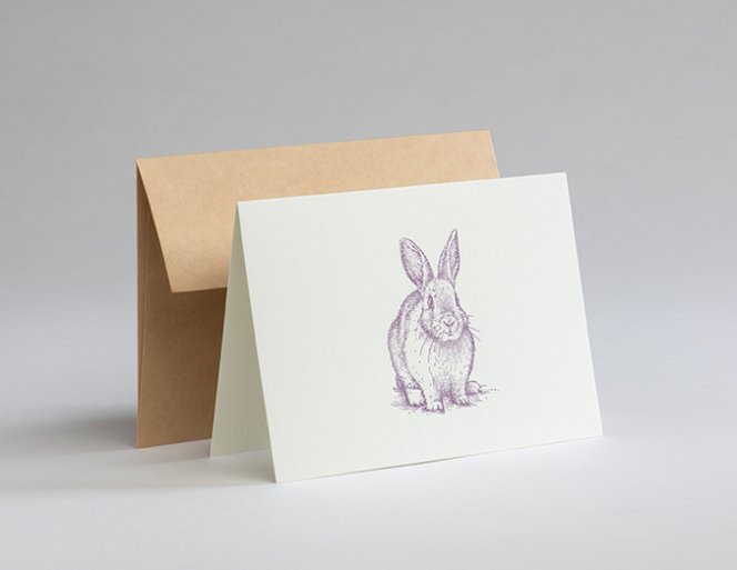 Der Hase - unser beliebtes Motiv zu den Ostertagen auf einer Klappkarte umgesetzt. Violetter Buchdruck auf feinen, pastelligen Papierfarben aus der Gmund Papier Kollektion. Kombiniert mit einem Kuvert aus nachhaltigem, ungebleichtem Papier. Eine wunderschöne Grußkarte, die durch hochwertiges Druckhandwerk zu begeistern weiß.
