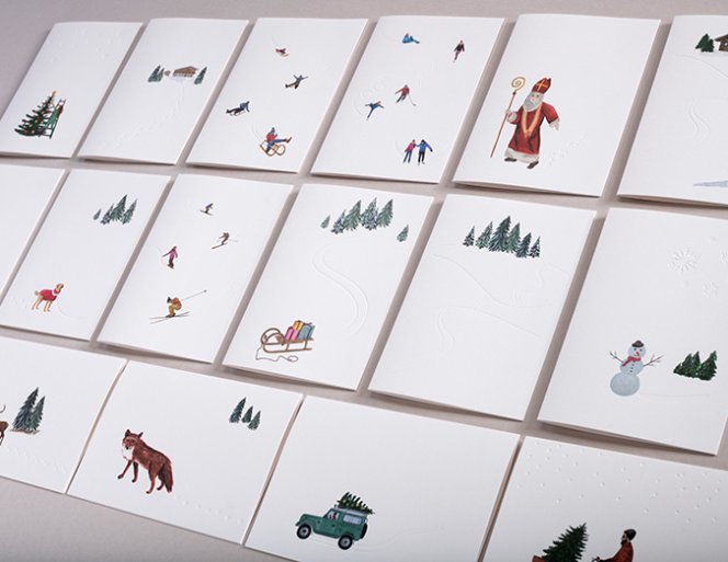 Das voluminöse Papier aus 100% Baumwollfaser ist aufgrund seiner Beschaffenheit prädestiniert für Buchdruck-Anwendungen. Mit einer filigranen Blindprägung wurde hier eine Winterspur nachgeahmt. Kombiniert mit dem satten Offsetdruck entsteht hier ein wunderschönes winterliches Motiv, welches nicht nur optisch, sondern auch haptisch, wahre Freude macht.
