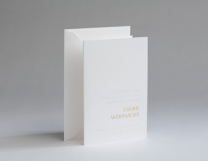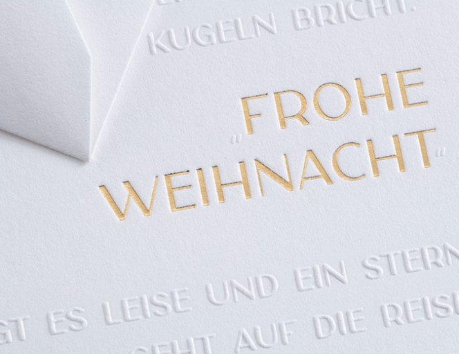 Erhabene Prägung in Kombination mit der feinsten Auswahl an Gmund Papieren. Zurückhaltend Stilsicher und trotzdem zugleich so ausdrucksstark. Ein klassiches Weihnachtsgedicht weckt Erinnerungen aus früheren Tagen. Die Gmund Grußkartenserie zur Weihnachtszeit kombiniert echtes Druckhandwerk mit edler Papiermacherkunst vom Tegernsee. Mit einem Gmund Cotton Kuvert mit Spitzklappe und Seidenfutter eine echte Wertschätzung für jeden Adressaten.