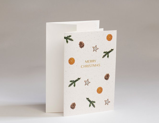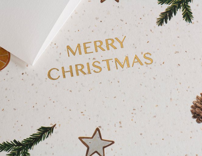 Weihnachtliche Karte mit goldener Heißfolie auf Gmund Bier Papier. Inklusive passender Briefhülle.