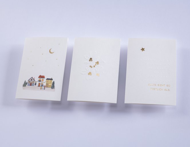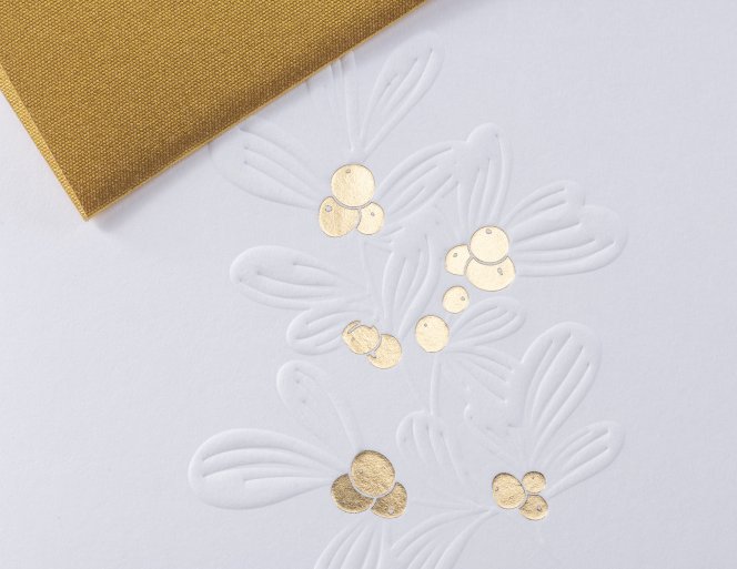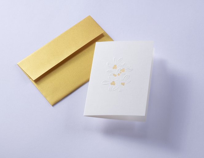 Eine stille, elegante Botschaft in der Weihnachtszeit. Die Karte verzaubert mit einem feinen Mistelzweig, der sich dezent vom sanftweißen Baumwollpapier abhebt. Die goldenen Beeren setzen einen zarten, festlichen Glanz, der Licht einfängt und Wärme schenkt. Das ausgewählte Baumwollpapier und die meisterhafte Prägung verbinden sinnliches Erleben mit hochwertiger Ästhetik. Karte und Umschlag sind perfekt aufeinander abgestimmt – ein harmonisches Duo, das Wertigkeit in jedem Detail zeigt.
