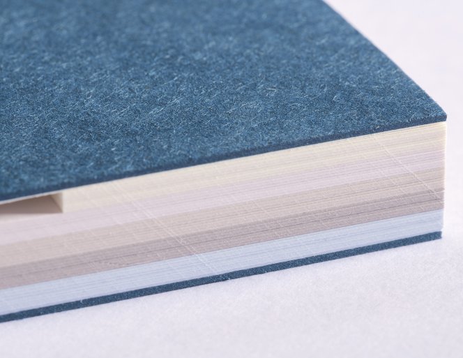 The colored interior paper is certified Cradle to Cradle Silver. The cover is made from 100% natural board produced from recycled material and finished with a delicate hot-foil stamping.