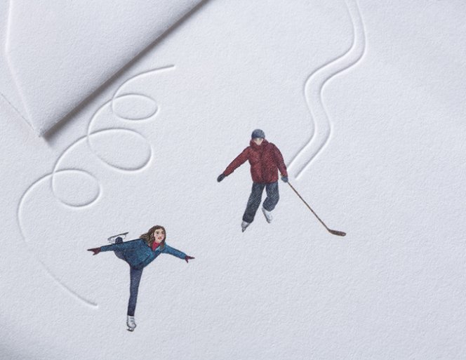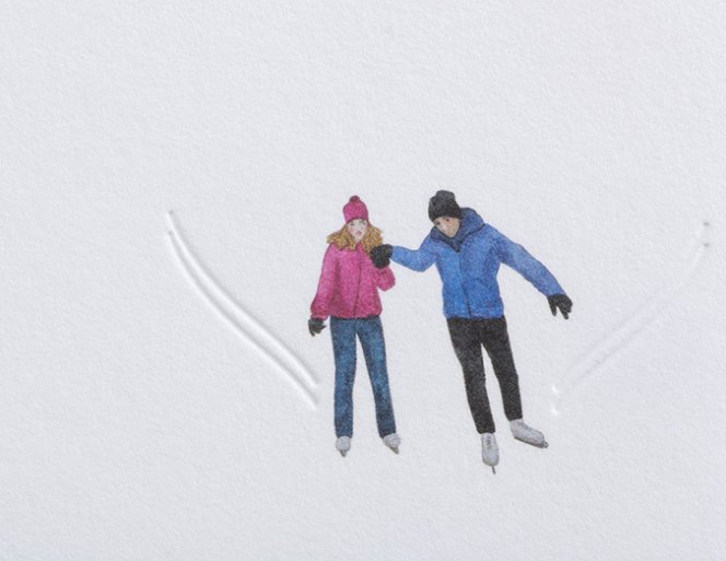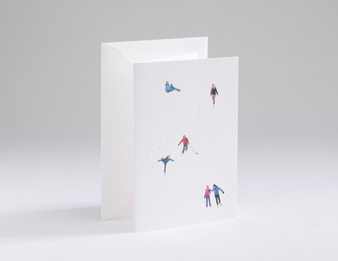 In the mood for winter? The deep embossing on the delicate paper made of 100% cotton fibers has the appearance of a real track on the ice. Lovingly illustrated ice skating motifs in rich offset printing and deeply embossed tracks in the ice combine to create a beautiful, wintry motif.