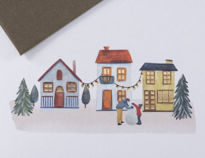 Cette carte de vœux raffinée en papier 100 % coton de Gmund allie qualité et esthétique. Une rangée de maisons joliment illustrée est illuminée par de fins détails dorés à chaud - de petits points de lumière dans les fenêtres et sur une guirlande lumineuse créent une atmosphère particulière.